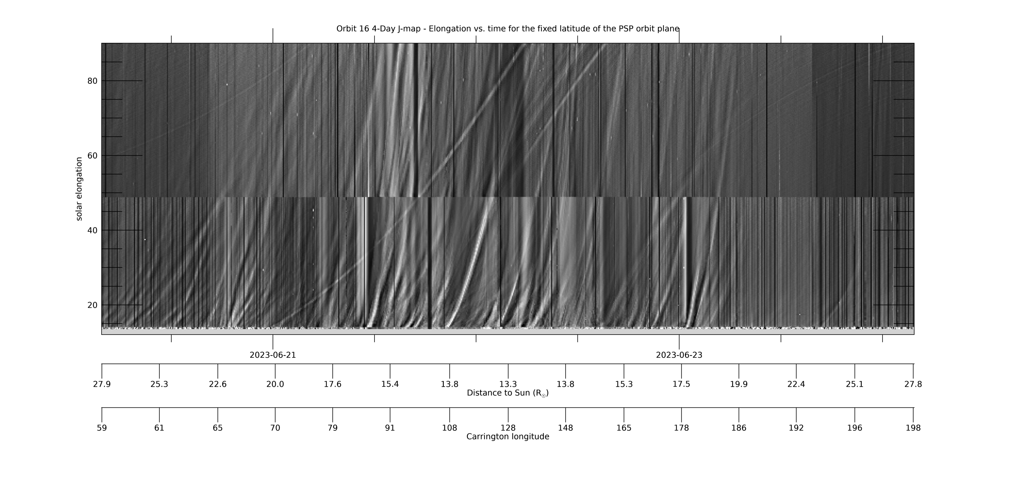 The following data products are J-maps, R-maps, and Lat-maps for this Encounter, provided by NASA/JPL/CALTECH. Some reference on the use and interpretation of elongation versus time maps (aka J-maps) are Sheeley et al., 1999 ( DOI: 10.1029/1999JA900308), Sheeley et al., 2008 ( DOI: 10.1086/529020) and Rouillard et al., 2010 ( DOI: 10.1029/2009JA014472). A reference for the creation and use of R-maps is Nindos et al., 2021 (DOI: 10.1051/0004-6361/202039414). Various ways of constructing Latitude versus Time maps are described in Poirier et al., 2020 (DOI:  10.3847/1538-4365/ab6324), Nindos et al., 2021  (DOI: 10.1051/0004-6361/202039414), and Liewer et al., 2023  (DOI: /10.3847/1538-4357/acc8c7).