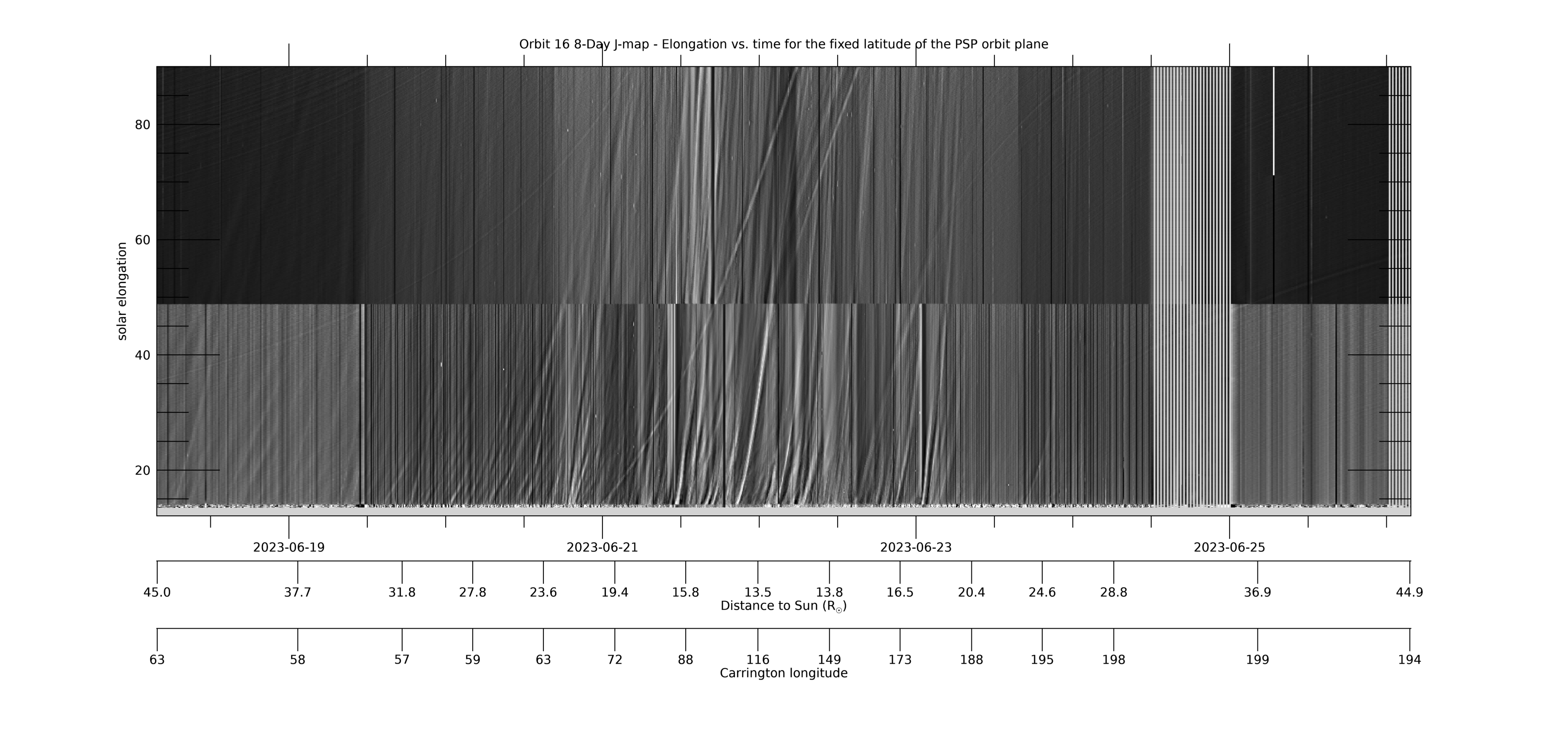 [ABOVE] This 8-day WISPR J-map shows solar elongation (angle from the Sun center) versus time at a fixed latitude measured relative to the PSP-Venus orbit plane. It is created from composite LW-processed full field-of-view (FOV) composite images such as those in the LW movie above, in which the PSP-Venus orbit plane is marked with a blue line. For each image (each time), data is collected along the PSP-Venus orbit plane for the full range of elongations in the WISPR FOV. The collected data is then stacked in time (x-axis) with elongation as the y-axis. The WISPR movies at this web site can be used to identify and find the cause of the various features seen in the J-map. Below the time axis are two additional axes showing PSP’s distance to the Sun RP and its Carrington longitude at that time. The time span in this and subsequent maps is centered on the time of perihelion. [Credit: NASA/JPL. Data processed by Paulo Penteado (JPL/Caltech).]