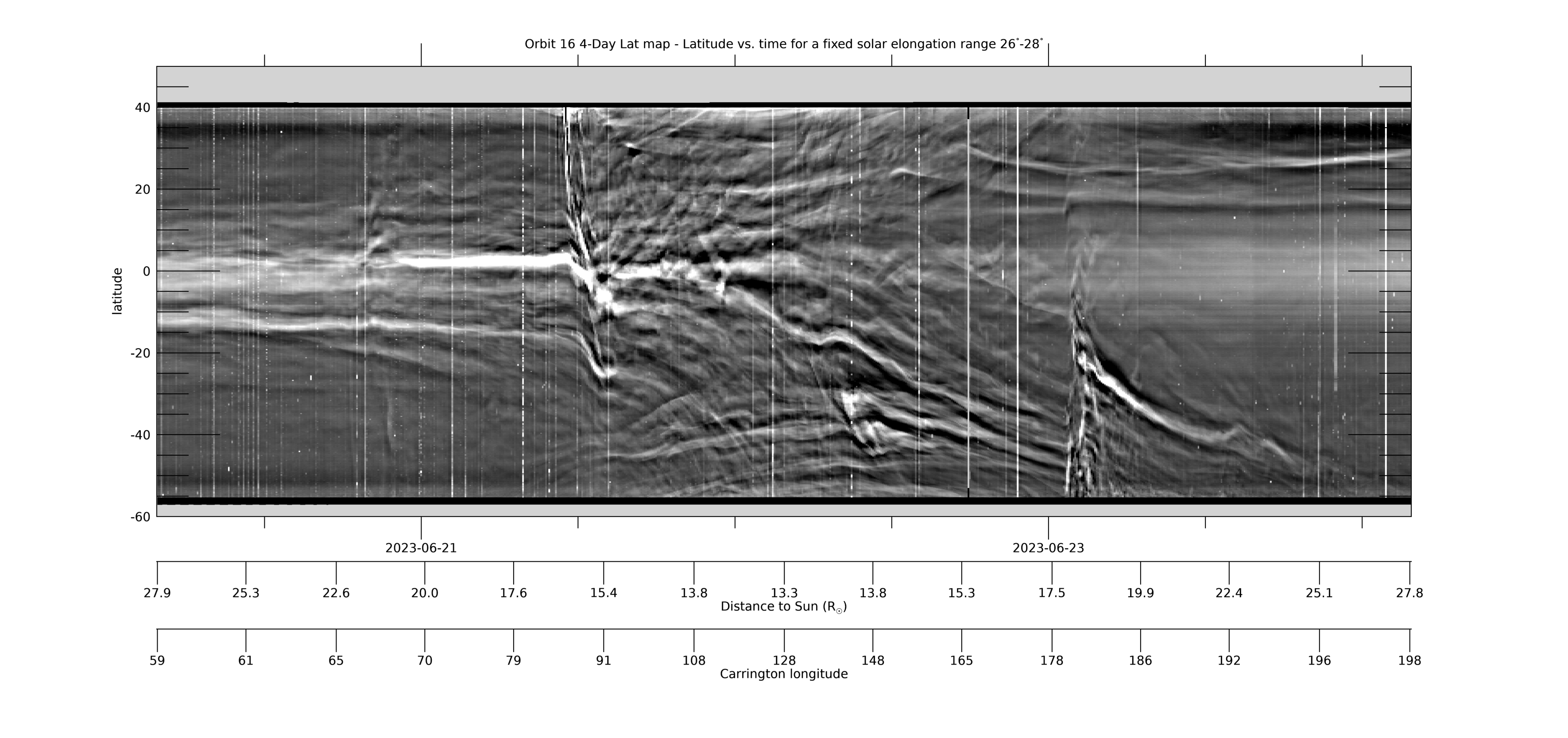 [ABOVE] This 4-day Lat-map shows the evolution in latitude, measured from the PSP-Venus orbit plane, for a fixed solar elongation of 26°-28°. The map is created from L3-processed images by collecting the arc of data in the WISPR-I FOV in the range 26°-28°elongation from each image and stacking the data horizontally in time (for details, see Liewer et al, 2023; DOI: 10.3847/1538-4357/acc8c7). Near perihelion when PSP is moving faster than the Sun rotates, quasi-stationary coronal rays may show large changes in apparent latitude as they approach and pass over or under the spacecraft. The map was created using L3 processed images. The L3 movies at this web site can be used to identify features seen in the Lat-map. [Credit: NASA/JPL. Data processed by Paulo Penteado (JPL/Caltech).]