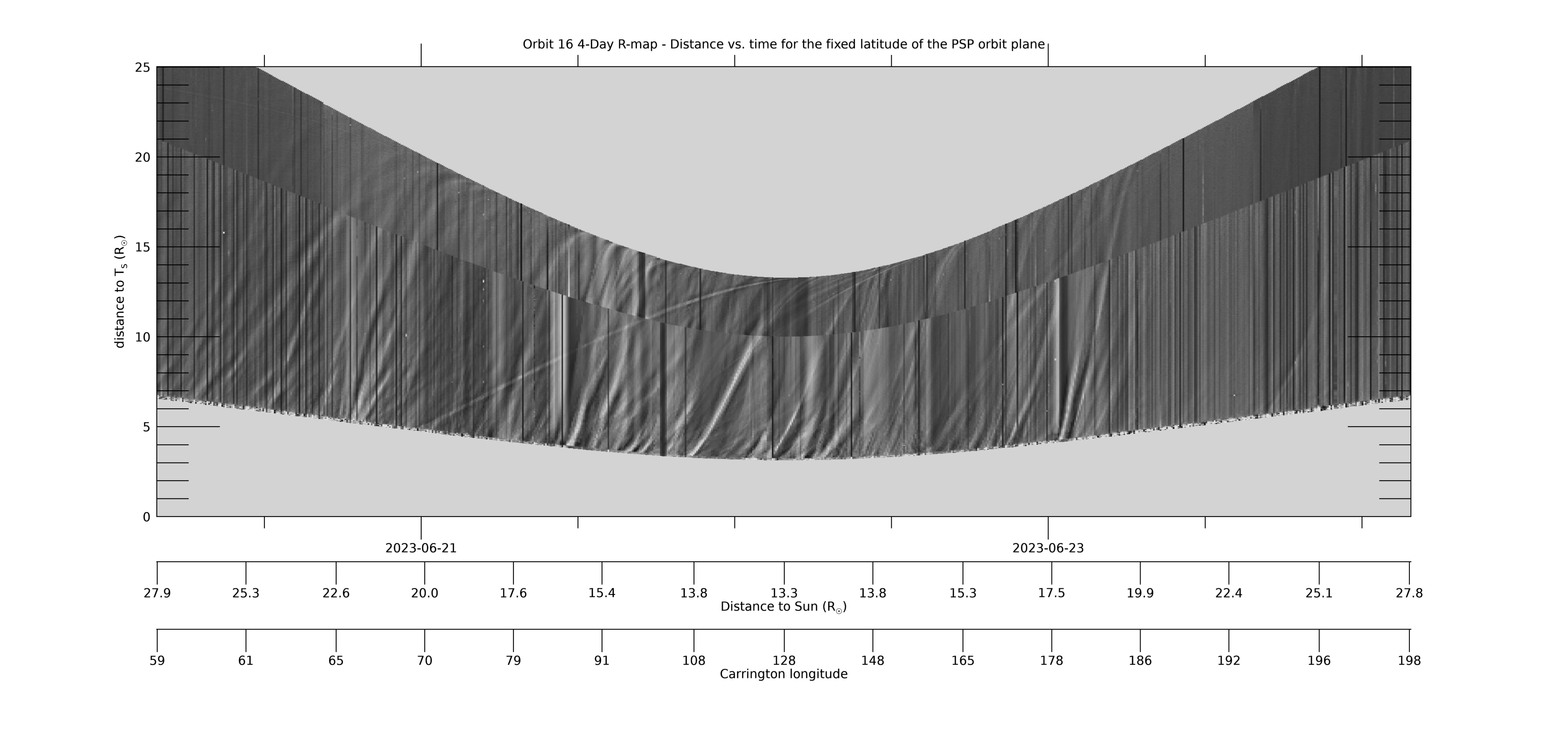 [ABOVE] This 4-day WISPR R-map shows the same data as the 8-day R-map above, but for only 4 days, centered on perihelion, to provide better resolution. See the caption for the 8-day R-map for more information.[Credit: NASA/JPL. Data processed by Paulo Penteado (JPL/Caltech).].