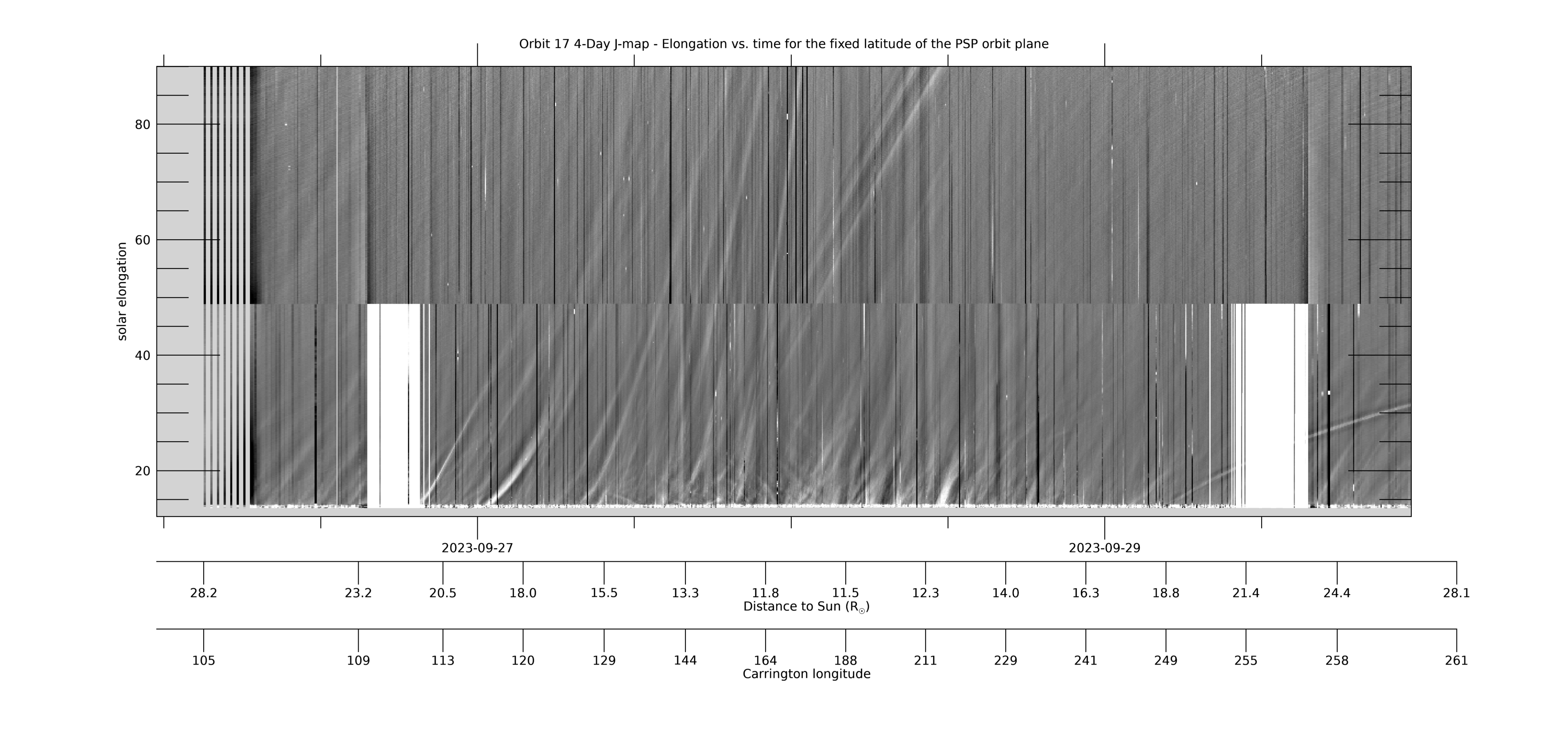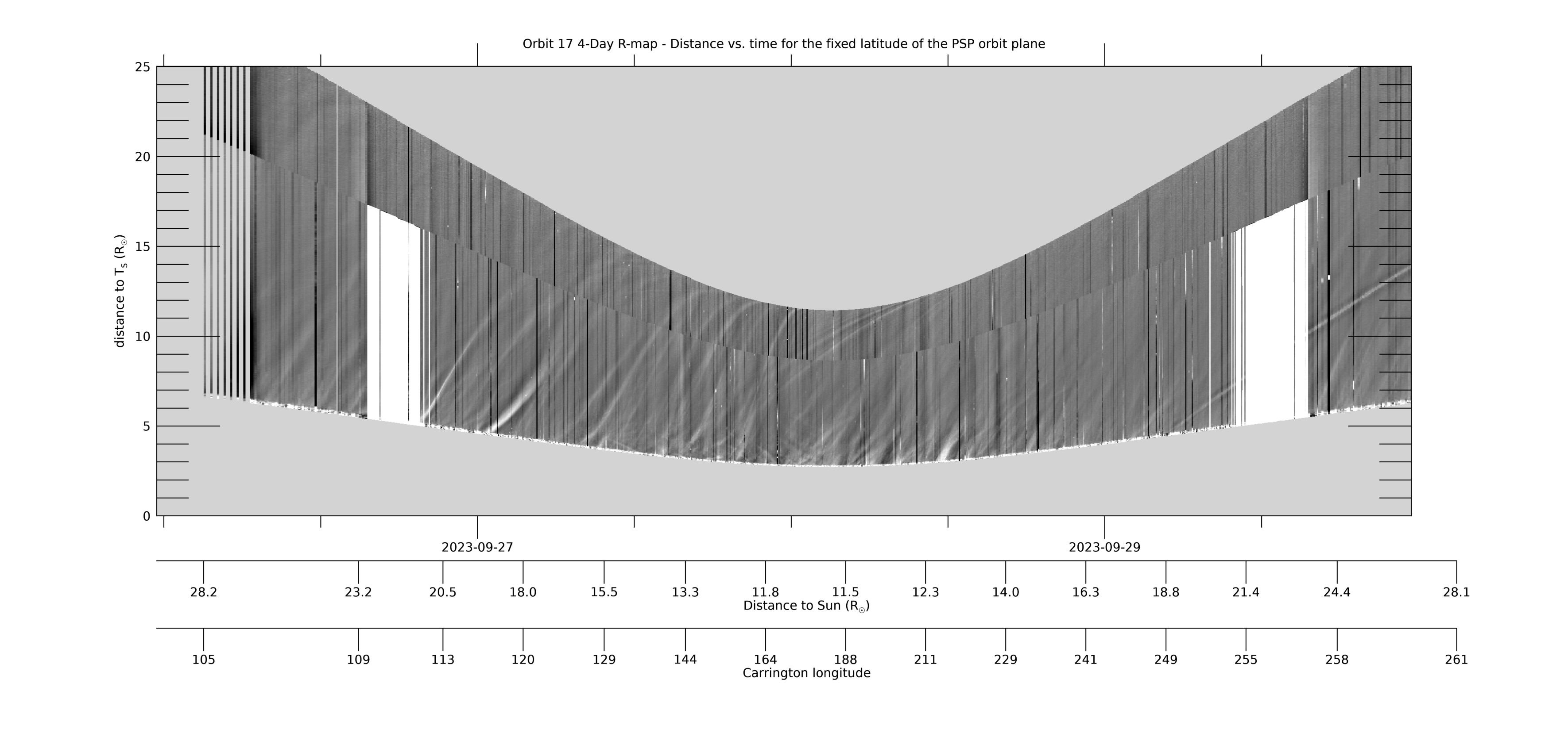 [ABOVE] This 4-day WISPR R-map shows the same data as the 8-day R-map above, but for only 4 days, centered on perihelion, to provide better resolution. See the caption for the 8-day R-map for more information.[Credit: NASA/JPL. Data processed by Paulo Penteado (JPL/Caltech).].