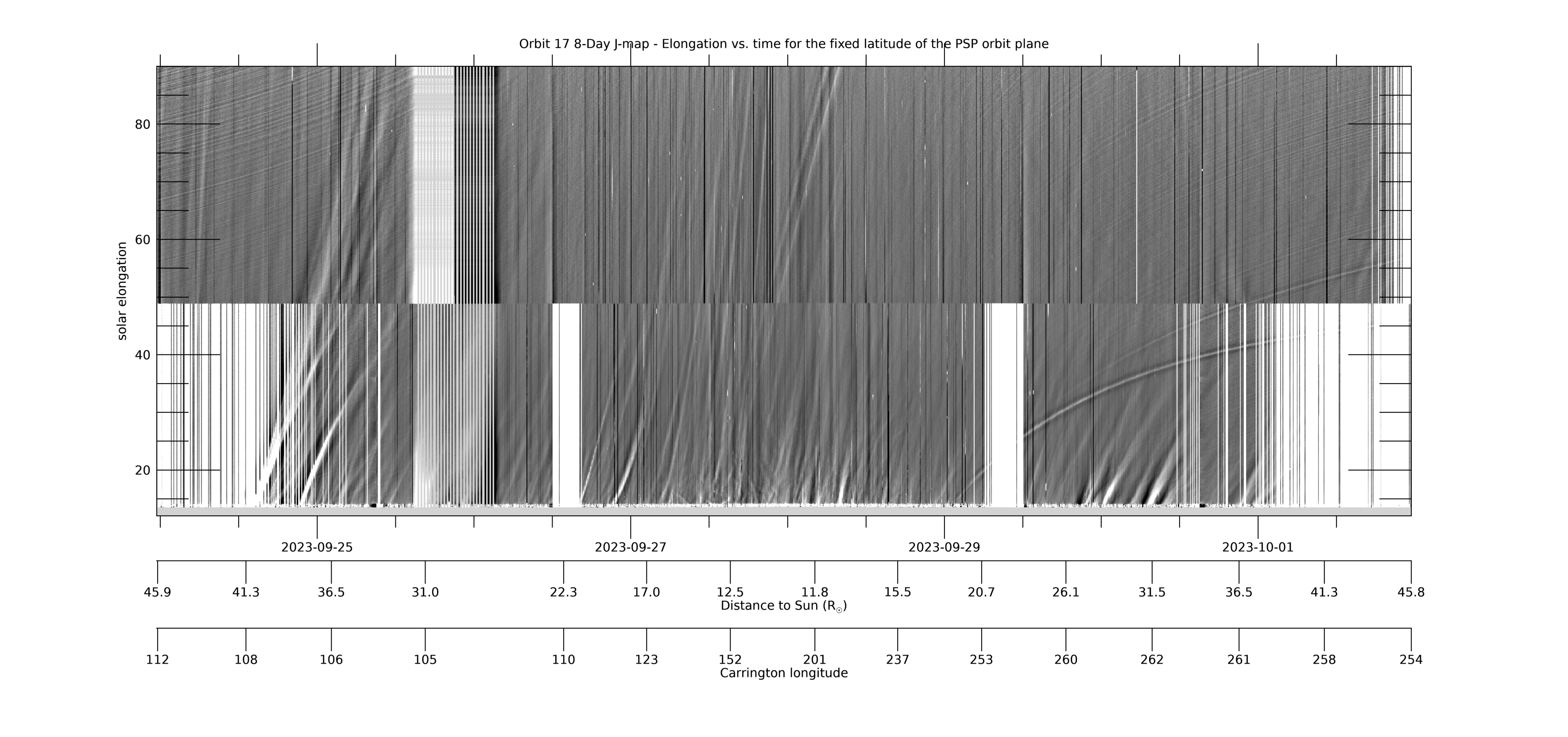 [ABOVE] This 8-day WISPR J-map shows solar elongation (angle from the Sun center) versus time at a fixed latitude measured relative to the PSP-Venus orbit plane. It is created from composite LW-processed full field-of-view (FOV) composite images such as those in the LW movie above, in which the PSP-Venus orbit plane is marked with a blue line. For each image (each time), data is collected along the PSP-Venus orbit plane for the full range of elongations in the WISPR FOV. The collected data is then stacked in time (x-axis) with elongation as the y-axis. The WISPR movies at this web site can be used to identify and find the cause of the various features seen in the J-map. Below the time axis are two additional axes showing PSP’s distance to the Sun RP and its Carrington longitude at that time. The time span in this and subsequent maps is centered on the time of perihelion. [Credit: NASA/JPL. Data processed by Paulo Penteado (JPL/Caltech).]