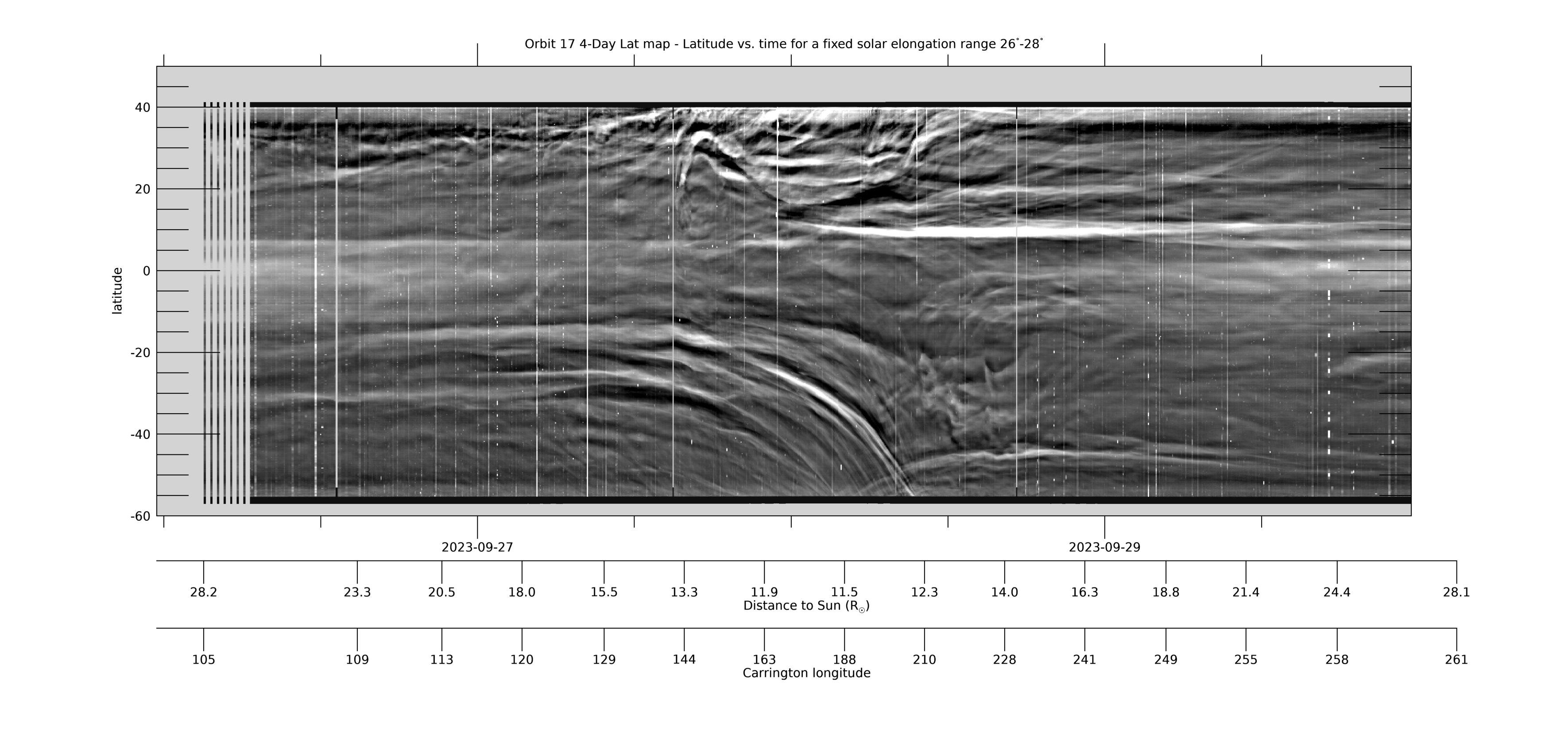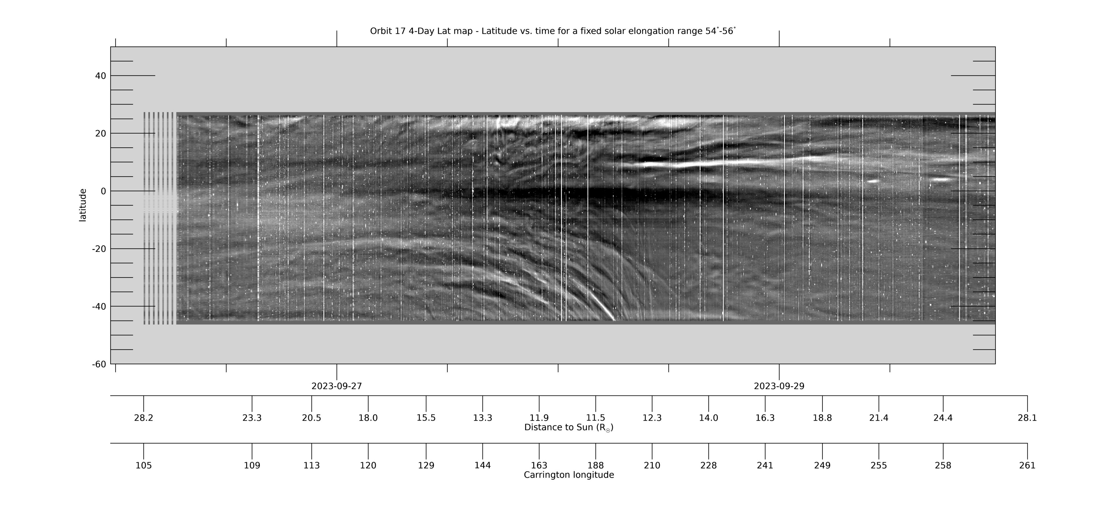 [ABOVE] This 4-day Lat-map shows the evolution in latitude, measured from the PSP-Venus orbit plane, by collecting the arc of data in the WISPR-O FOV for a fixed solar elongation range of 54°-56°. It is made in the same way as the WISPR-I Lat-map above. See that caption for more information. [Credit: NASA/JPL. Data processed by Paulo Penteado (JPL/Caltech).]