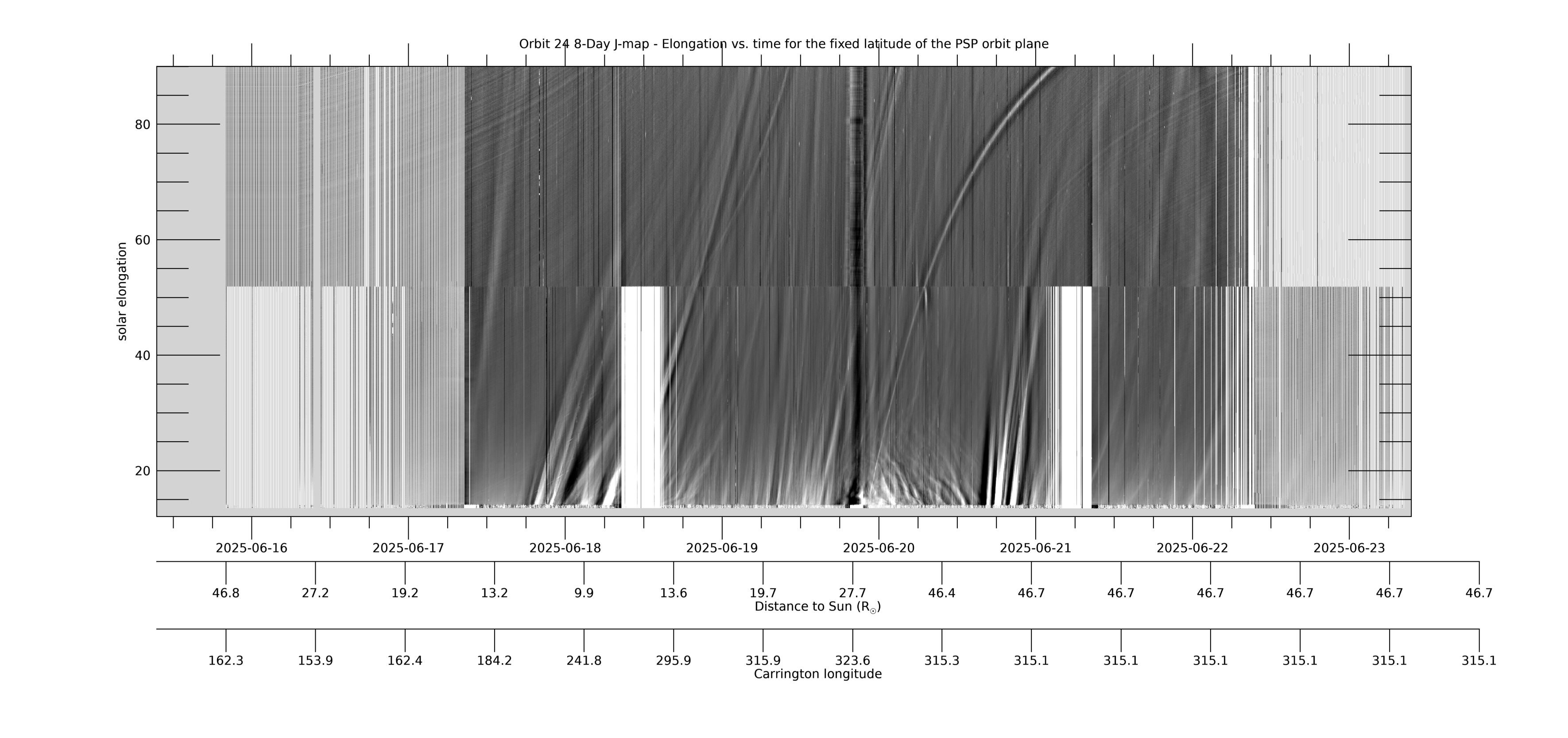 [ABOVE] This 8-day WISPR J-map shows solar elongation (angle from the Sun center) versus time at a fixed latitude measured relative to the PSP-Venus orbit plane. It is created from composite LW-processed full field-of-view (FOV) composite images such as those in the LW movie above, in which the PSP-Venus orbit plane is marked with a blue line. For each image (each time), data is collected along the PSP-Venus orbit plane for the full range of elongations in the WISPR FOV. The collected data is then stacked in time (x-axis) with elongation as the y-axis. The WISPR movies at this web site can be used to identify and find the cause of the various features seen in the J-map. Below the time axis are two additional axes showing PSP’s distance to the Sun RP and its Carrington longitude at that time. The time span in this and subsequent maps is centered on the time of perihelion. [Credit: NASA/JPL. Data processed by Paulo Penteado (JPL/Caltech).]