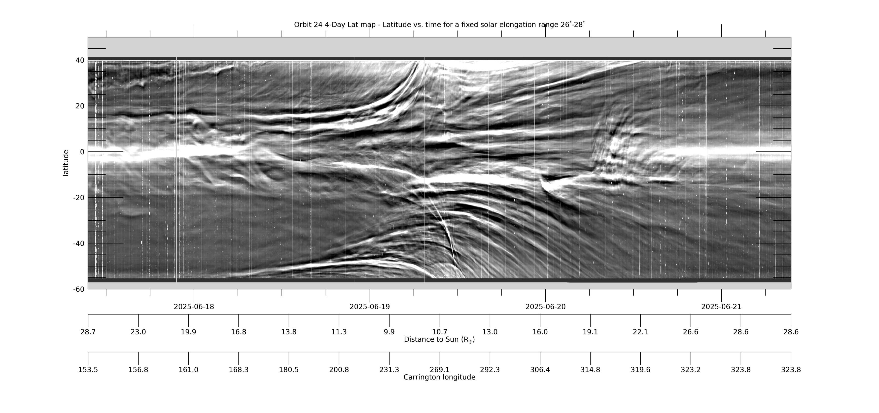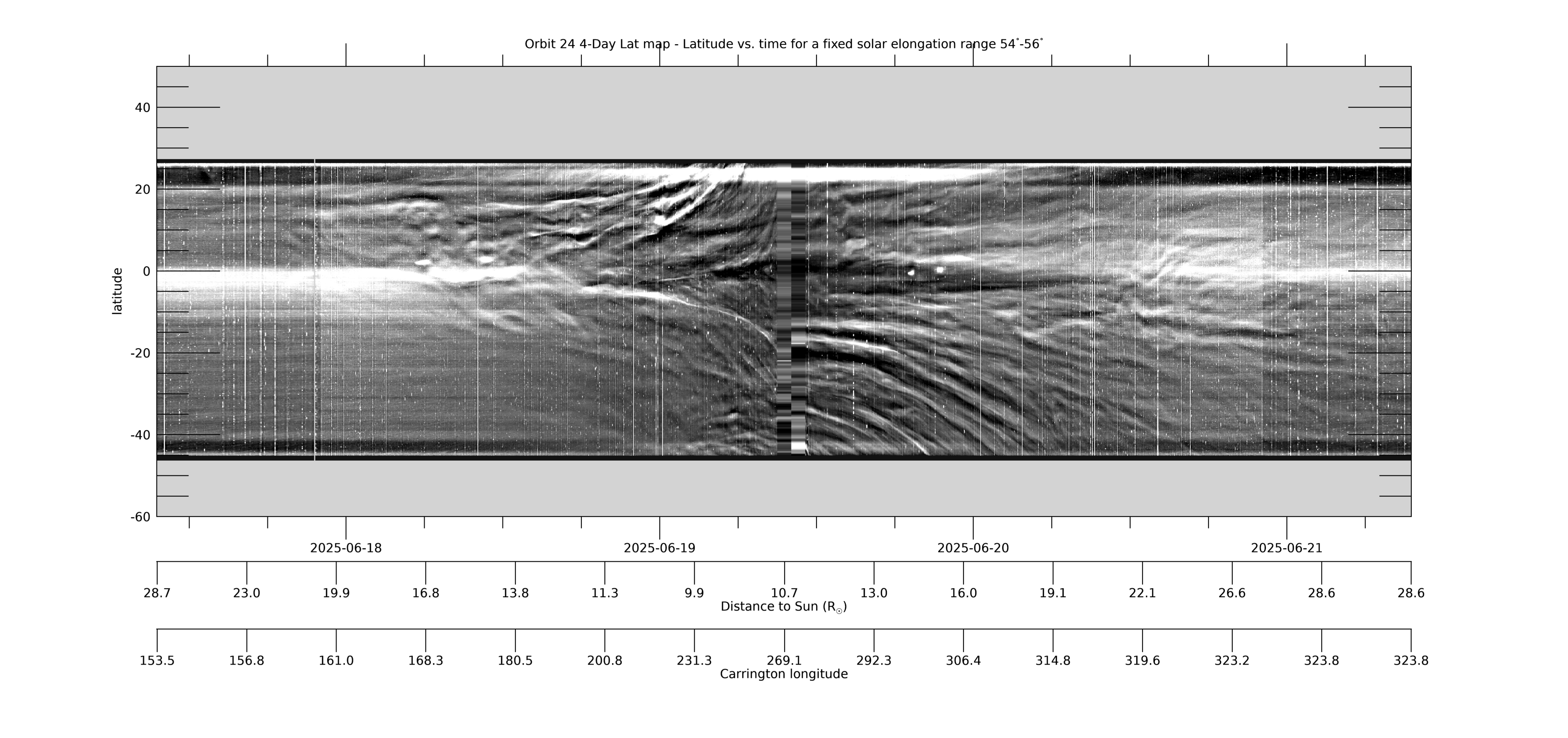 [ABOVE] This 4-day Lat-map shows the evolution in latitude, measured from the PSP-Venus orbit plane, by collecting the arc of data in the WISPR-O FOV for a fixed solar elongation range of 54°-56°. It is made in the same way as the WISPR-I Lat-map above. See that caption for more information. [Credit: NASA/JPL. Data processed by Paulo Penteado (JPL/Caltech).]