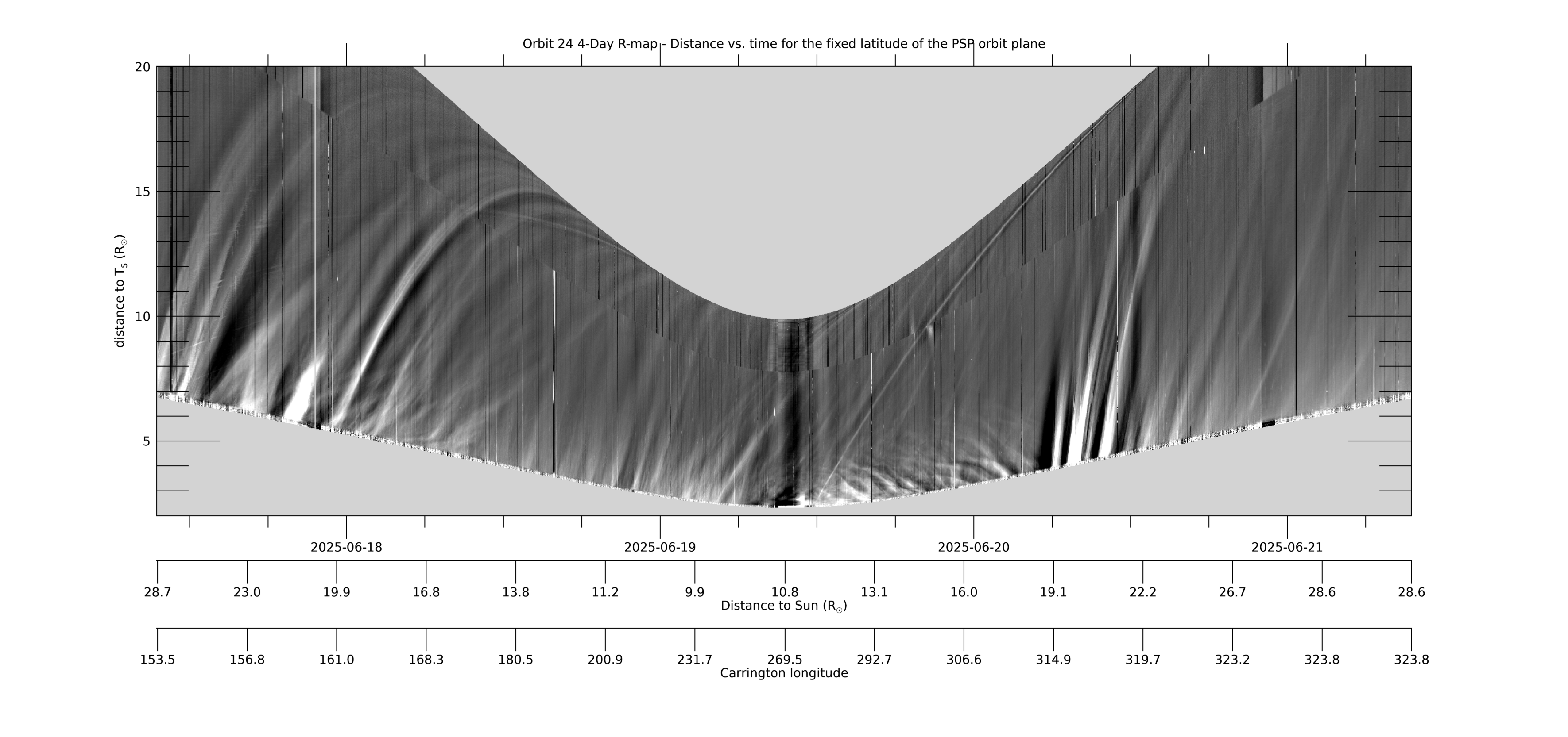 [ABOVE] This 4-day WISPR R-map shows the same data as the 8-day R-map above, but for only 4 days, centered on perihelion, to provide better resolution. See the caption for the 8-day R-map for more information.[Credit: NASA/JPL. Data processed by Paulo Penteado (JPL/Caltech).].