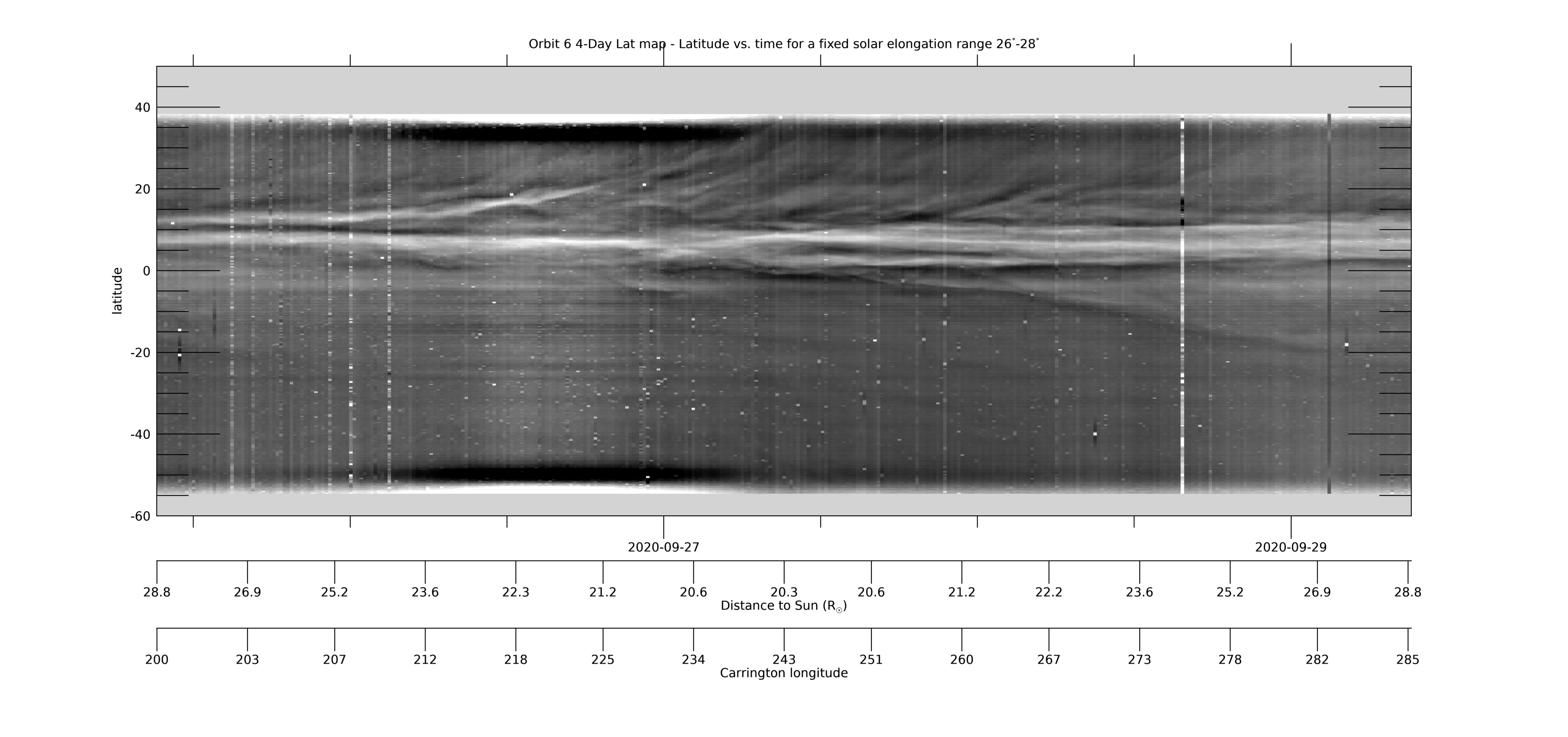 [ABOVE] This 4-day Lat-map shows the evolution in latitude, measured from the PSP-Venus orbit plane, by collecting the arc of data in the WISPR-O FOV for a fixed solar elongation range of 54°-56°. It is made in the same way as the WISPR-I Lat-map above. See that caption for more information. [Credit: NASA/JPL. Data processed by Paulo Penteado (JPL/Caltech).]